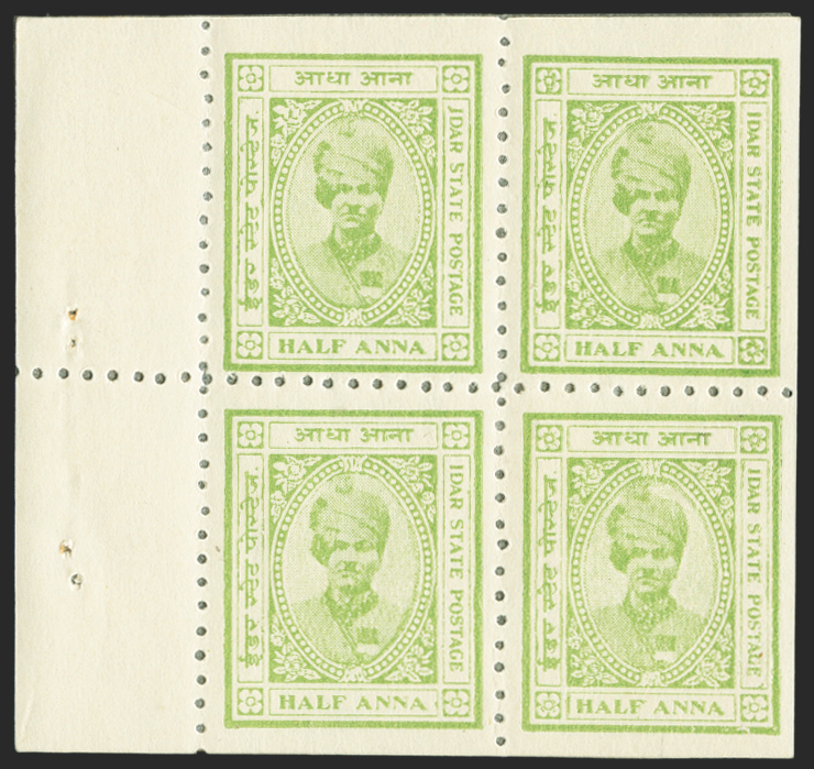 Indian Feudatory States Idar 1932-43 ½a (pale) yellow-green (thick paper), white panels, complete booklet pane of 4, SG1a.
