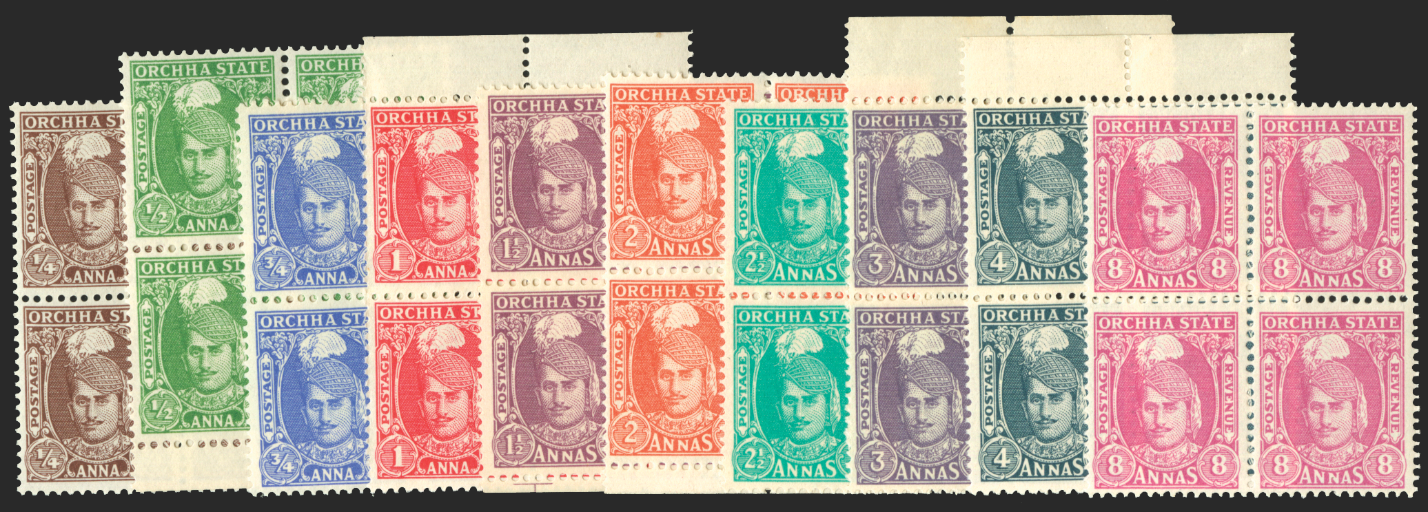 Indian Feudatory States Orchha 1939-42 set on 10 to 8a, (missing the 1¼a, SG35), in blocks of 4 (four being marginal examples), SG31/41.