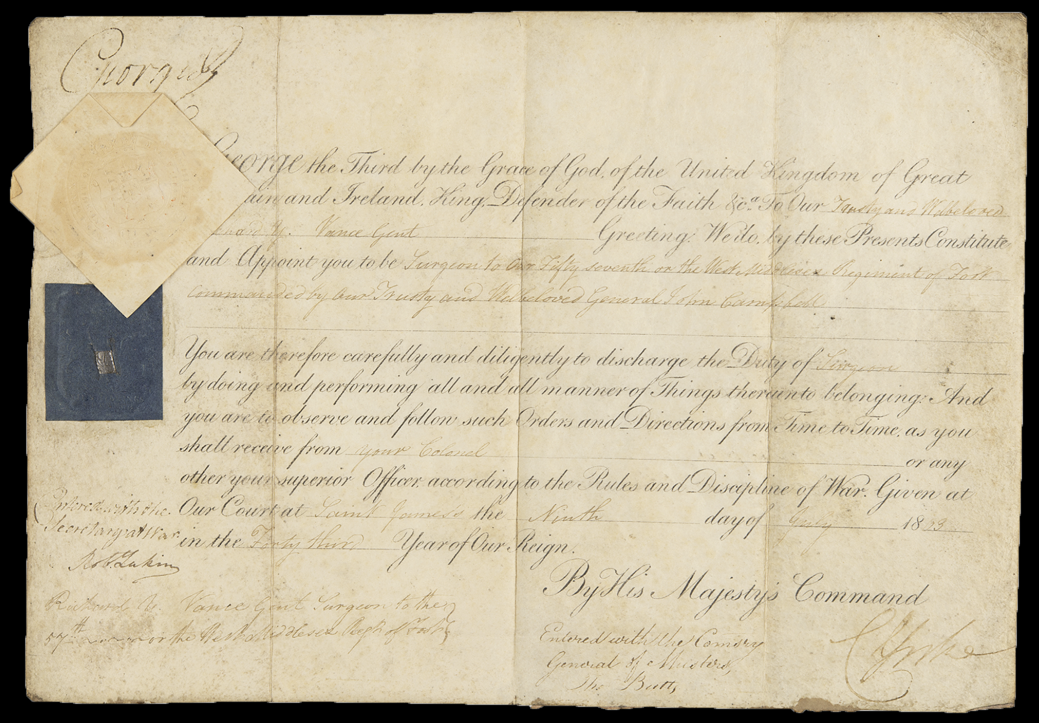 The document records the appointment of Richard Y Vance, “to be Surgeon to Our Fifty seventh of the West Middlesex Regiment of Foot commanded by Our Trusty and Welbeloved General John Campbell.”