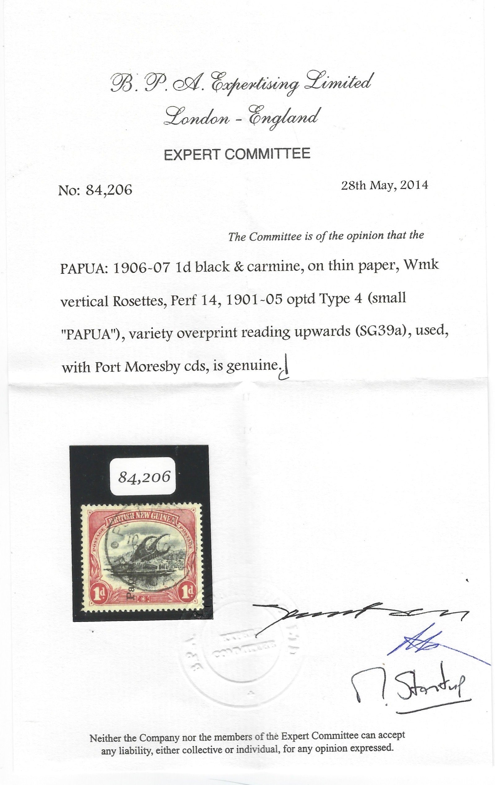 Thin paper, watermark vertical, type 4 small 'Papua'. Overprint, ERROR OVERPRINT READING UPWARDS, well-centred and very fine used with Port Moreby '10 JAN 08' circular date stamp as always.
