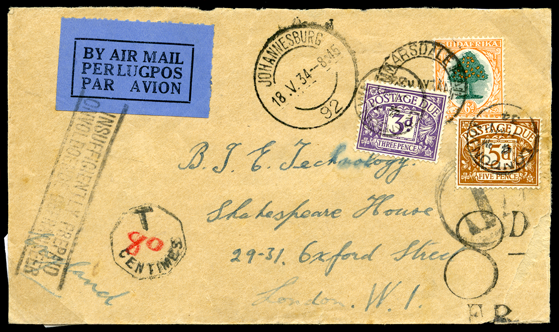 Great Britain Postage due airmail cover from South Africa, SGD14,D16