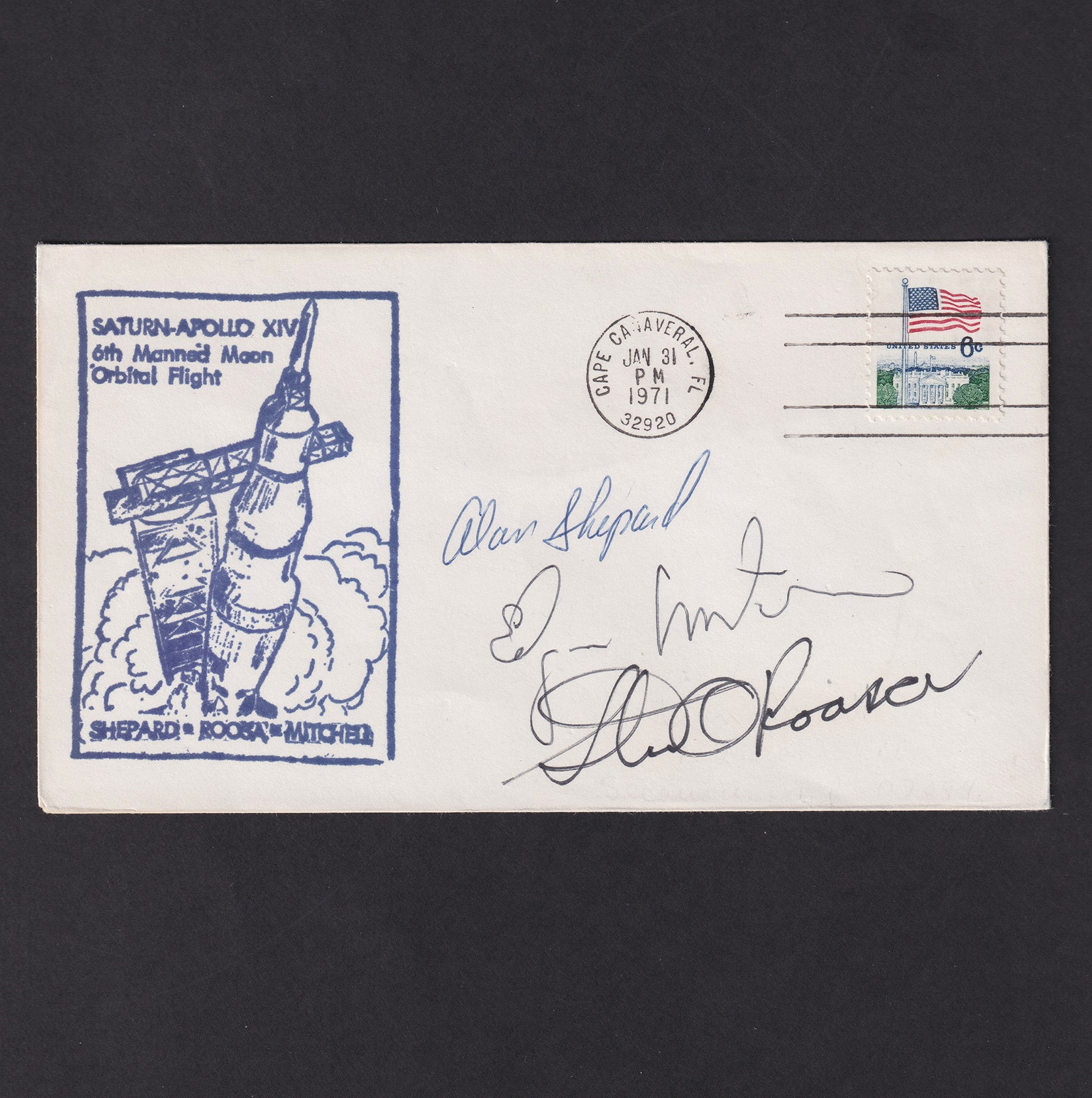 It is signed on the front in ink and felt tip by Alan Shepard, Edgar Mitchell, and Stu Roosa.