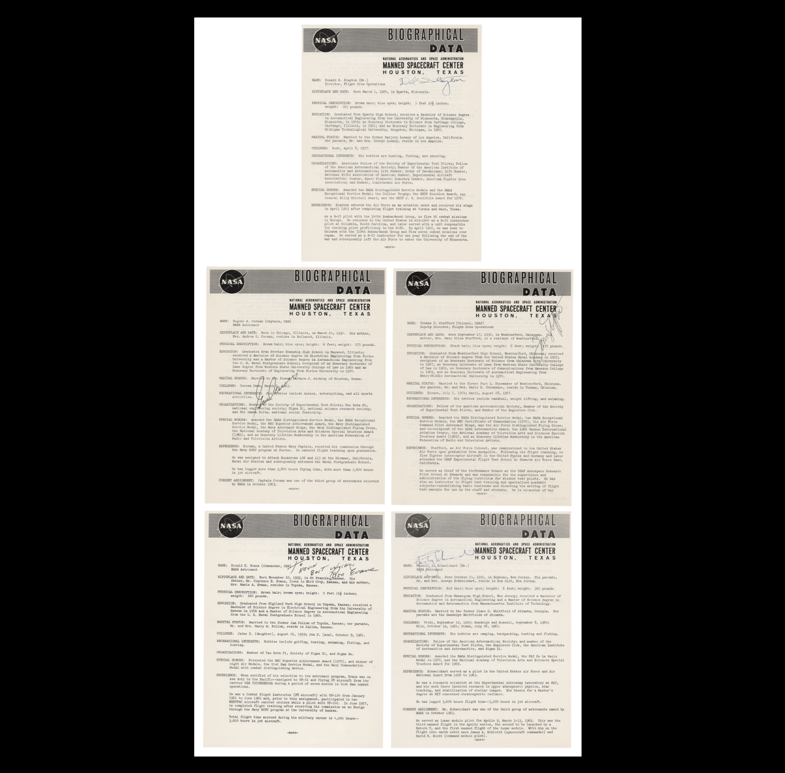 In this fine-condition set are: Gene Cernan, Ron Evans (with inscription), Rusty Schweickart, Deke Slayton, and Tom Stafford.