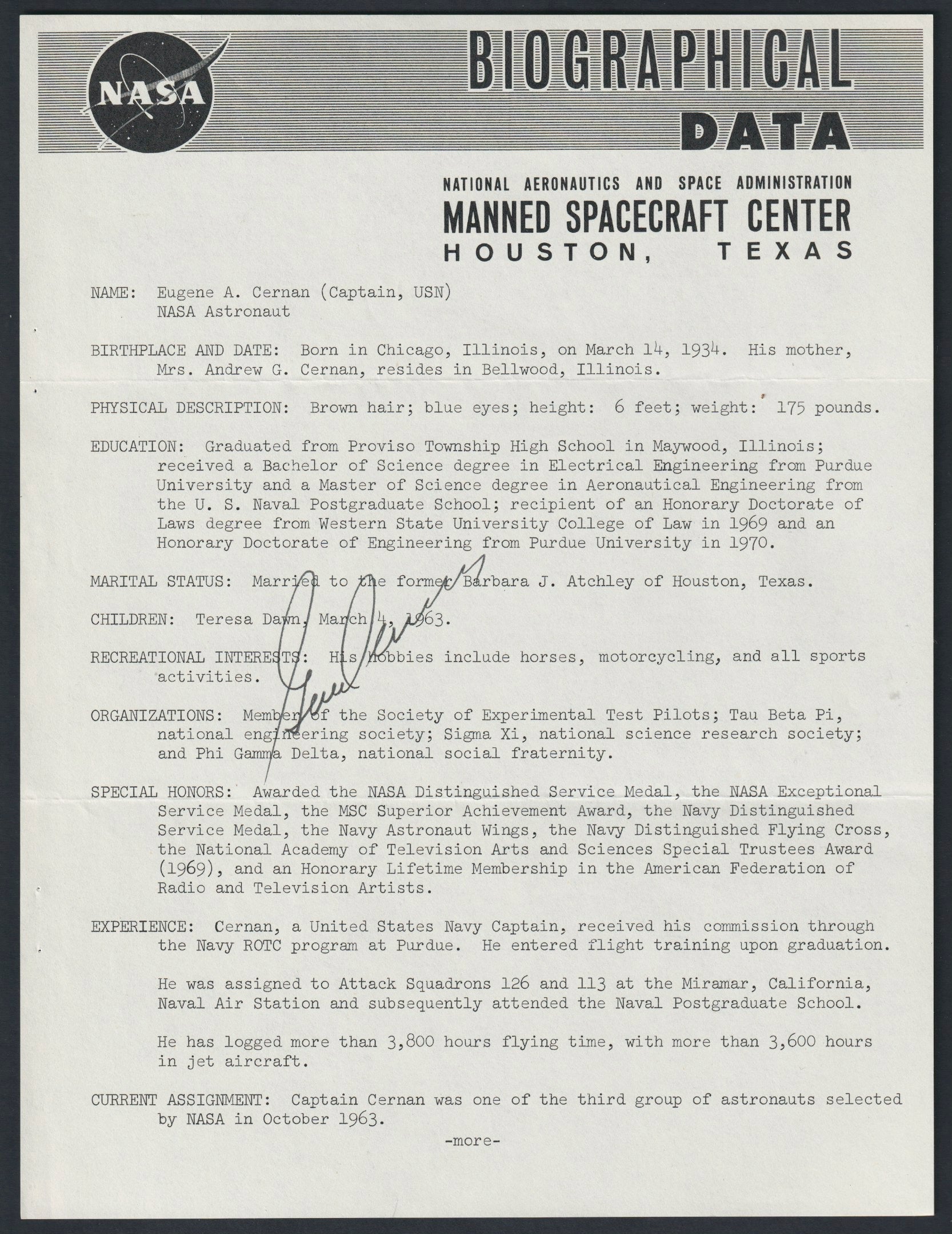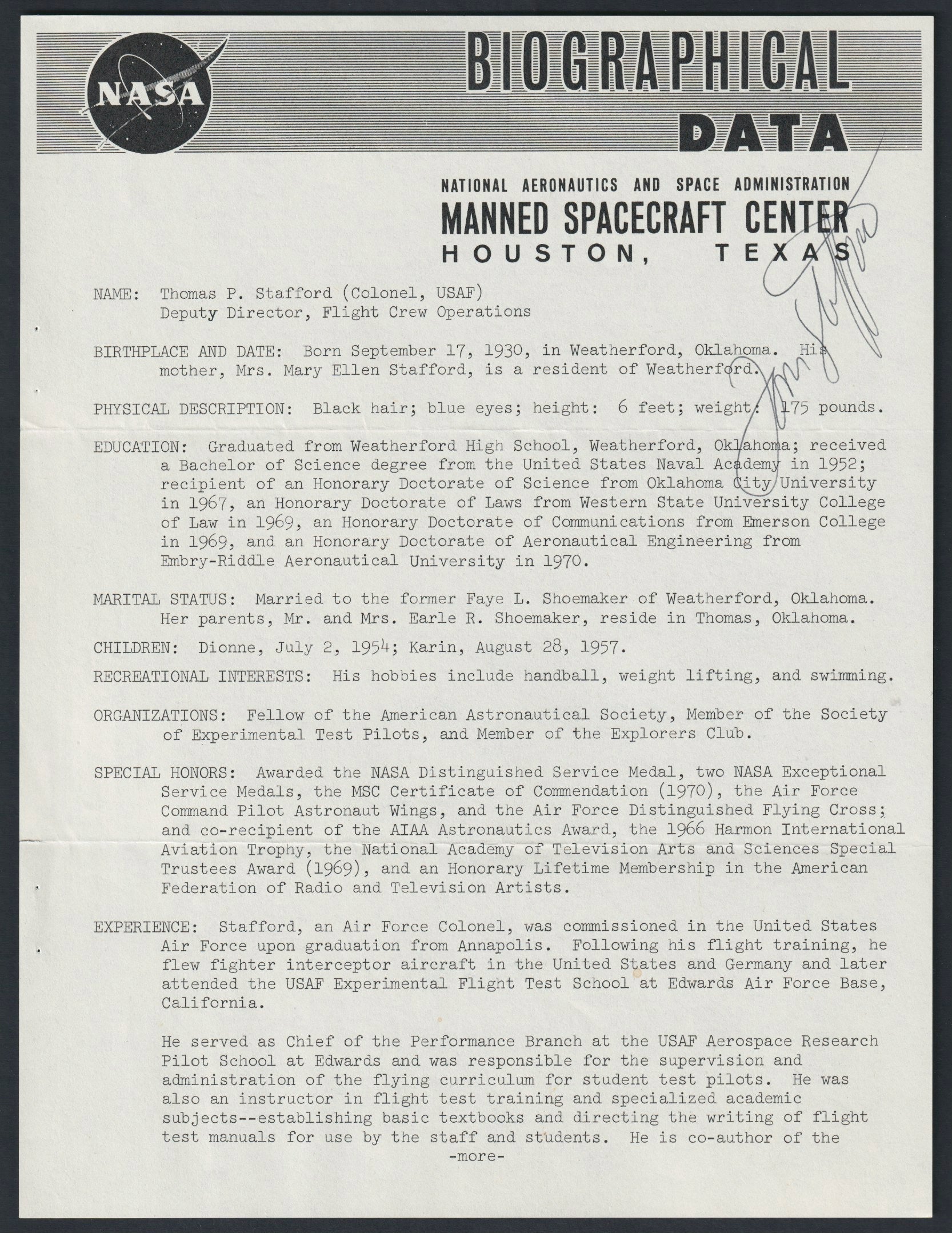 The typed biographies are on 8 x 10.5 inch sheets with full details of each astronaut's career, physique, family and so on.