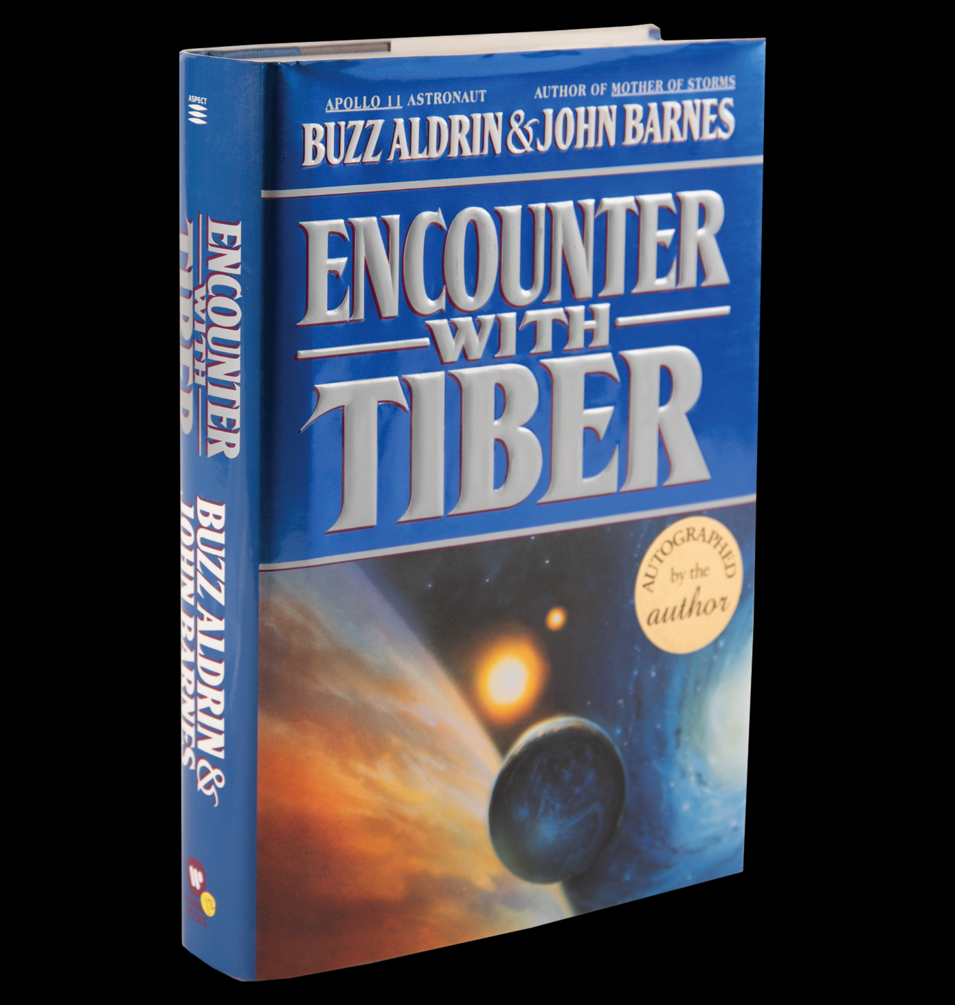 This 1996 printing (NY: Warner Books) of the 560 page, 6.5” x 9.25” novel Encounter with Tiber is handsomely signed on the title page by Buzz Aldrin in blue felt-tip pen.