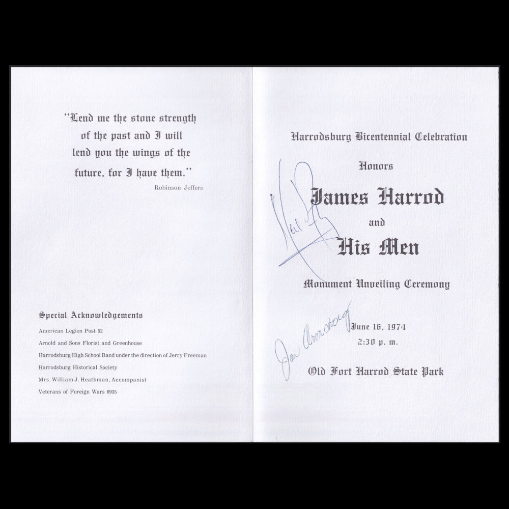 A Neil Armstrong signed event program for the 1974 Harrodsburg Bicentennial Celebration.