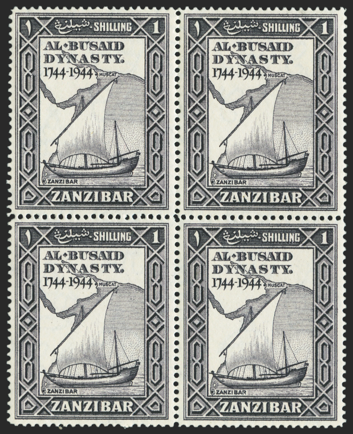 Zanzibar 1944 Bicentenary 1s dull purple, block of 4, the upper right stamp showing 'A' of 'CA' missing from watermark, SG330/a.