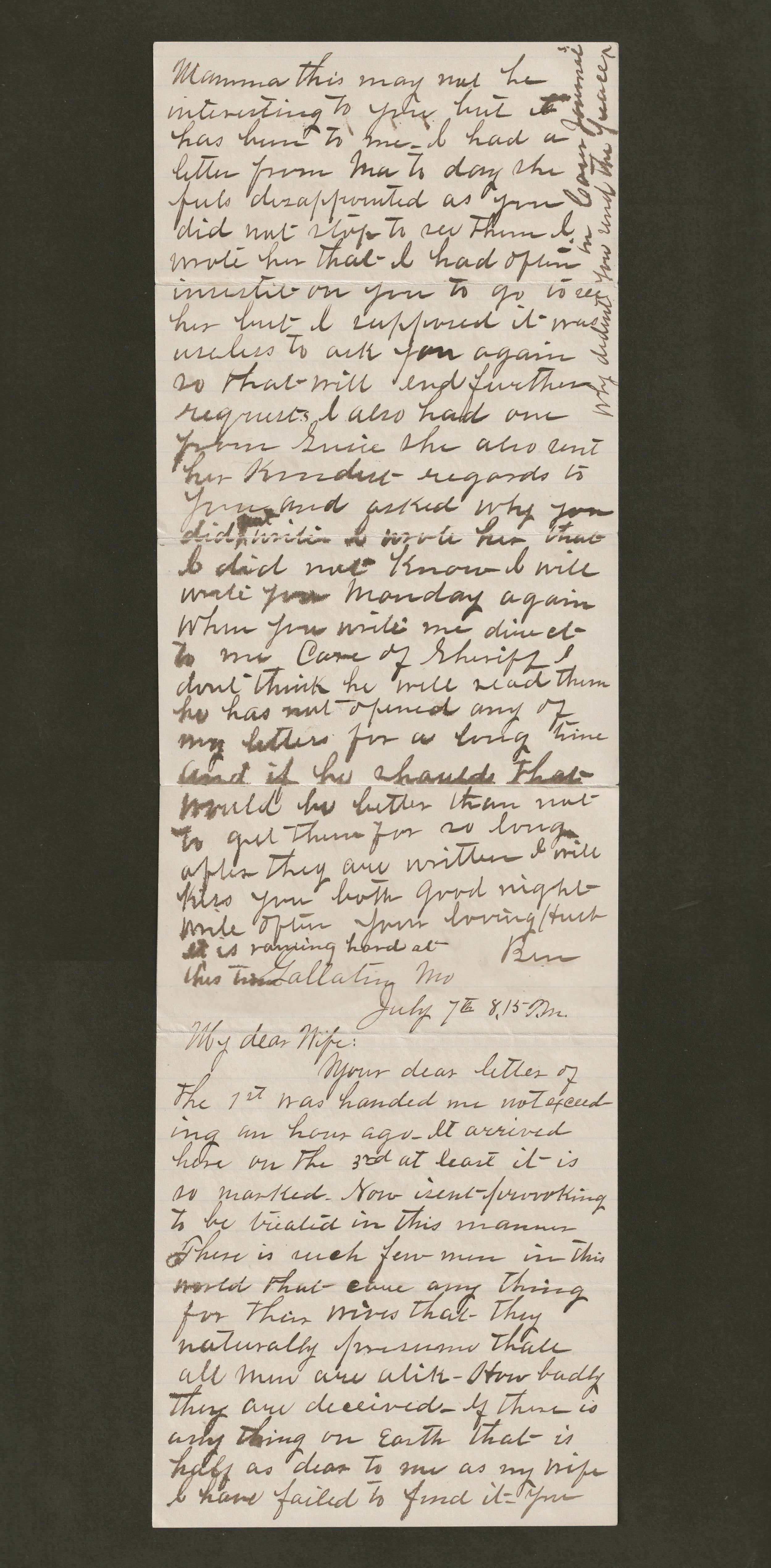 Your dear letter of the 1st was handed to me not exceeding an hour ago. It arrived here on the third, at least it is as marked. Now I sent foreword .. in this manner. There are very few men in this world that care anything for their wives, that they naturally suppose that all men are alike.