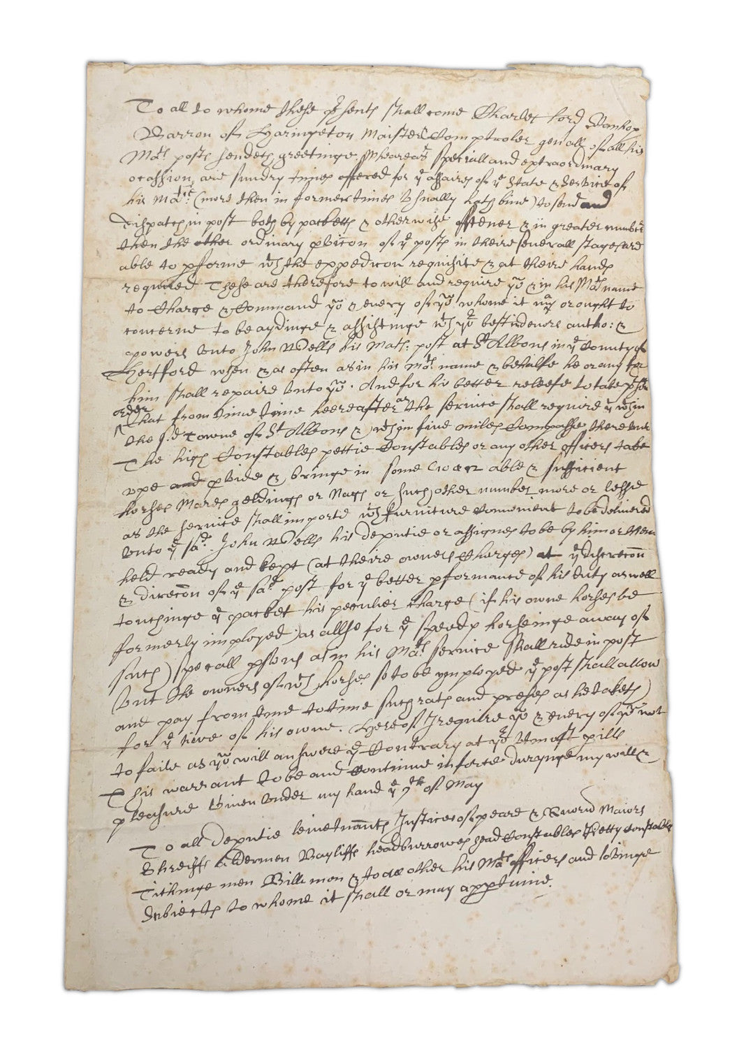 ...require you in his majesty's name to charge and command you and every of you whom it may or ought to concern to be aiding and assisting with your best endeavour authority and powers onto John Wells, his majesty's post at St Albans in the county of Hertford when and as often as in his majesty's name and behalf he or any for him shall repair unto you...