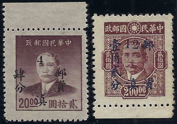 China 1949 Yunnan Province issued at Kumming, silver yuan surcharges with value in normal currency, 4c on $20 brown-purple and 12c on $200 chocolate, SG1342/43.
