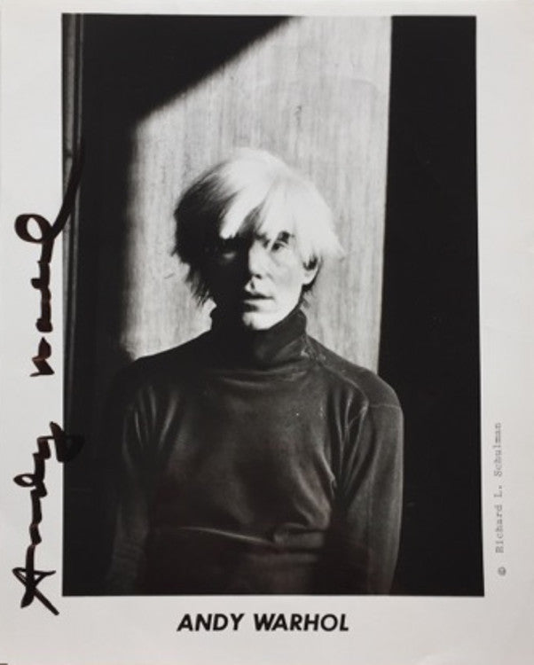 An iconic 10 x 8 inch black and white photograph of Andy Warhol (1928-1987) by Richard Schulman, signed on the left side by Warhol in black felt tip pen.