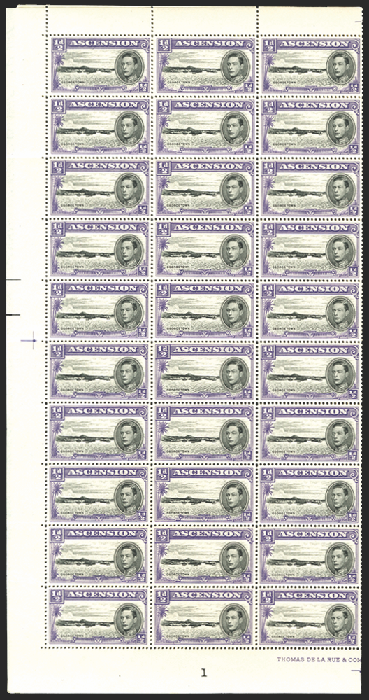 Ascension 1938-53 ½d black and violet, perforations 13, folded sheet of 60 (6x10) with full margins showing imprint and plate numbers.