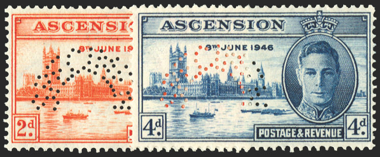 Ascension 1946 Victory 2d and 4d, perforated 'SPECIMEN' (type D21), SG48s/9s.