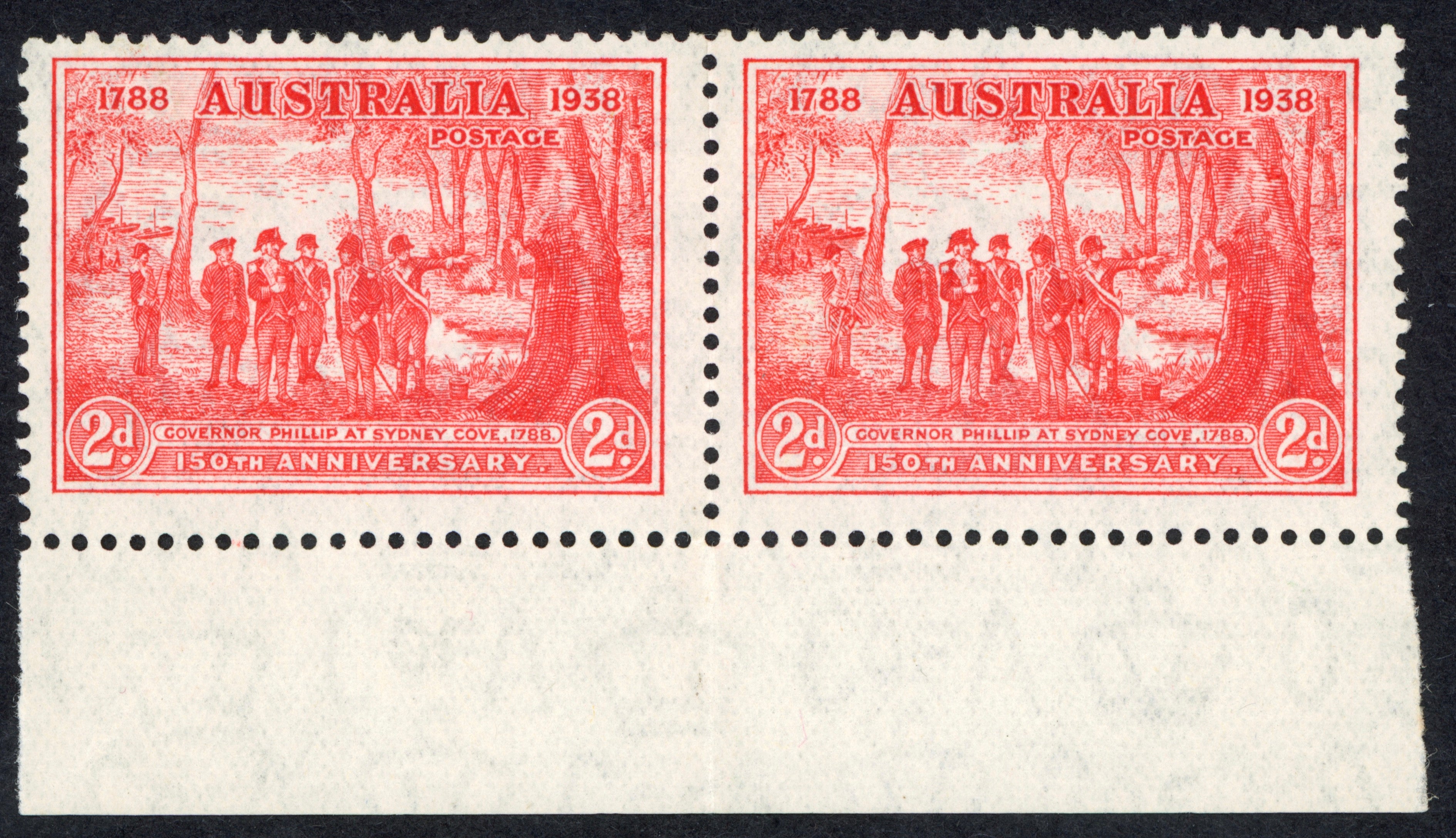 Australia 1937 2d scarlet "150th Anniversary of Foundation of New South Wales", lower marginal horizontal pair, the right-hand stamp with printing variety "PANTALOON FLAW AT LEFT RETOUCHED" (State II: R10/2), SG193var.