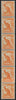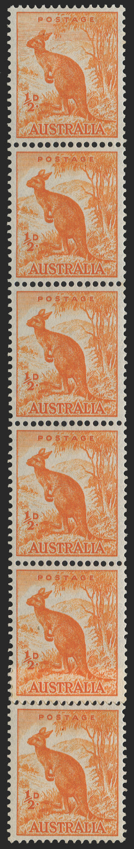 Australia 1948-56 ½d orange, no watermark SG228c/cb,, vertical coil strip of 6, showing the prominent variety 'Sky retouch' (right pane, R6/8) on top stamp.