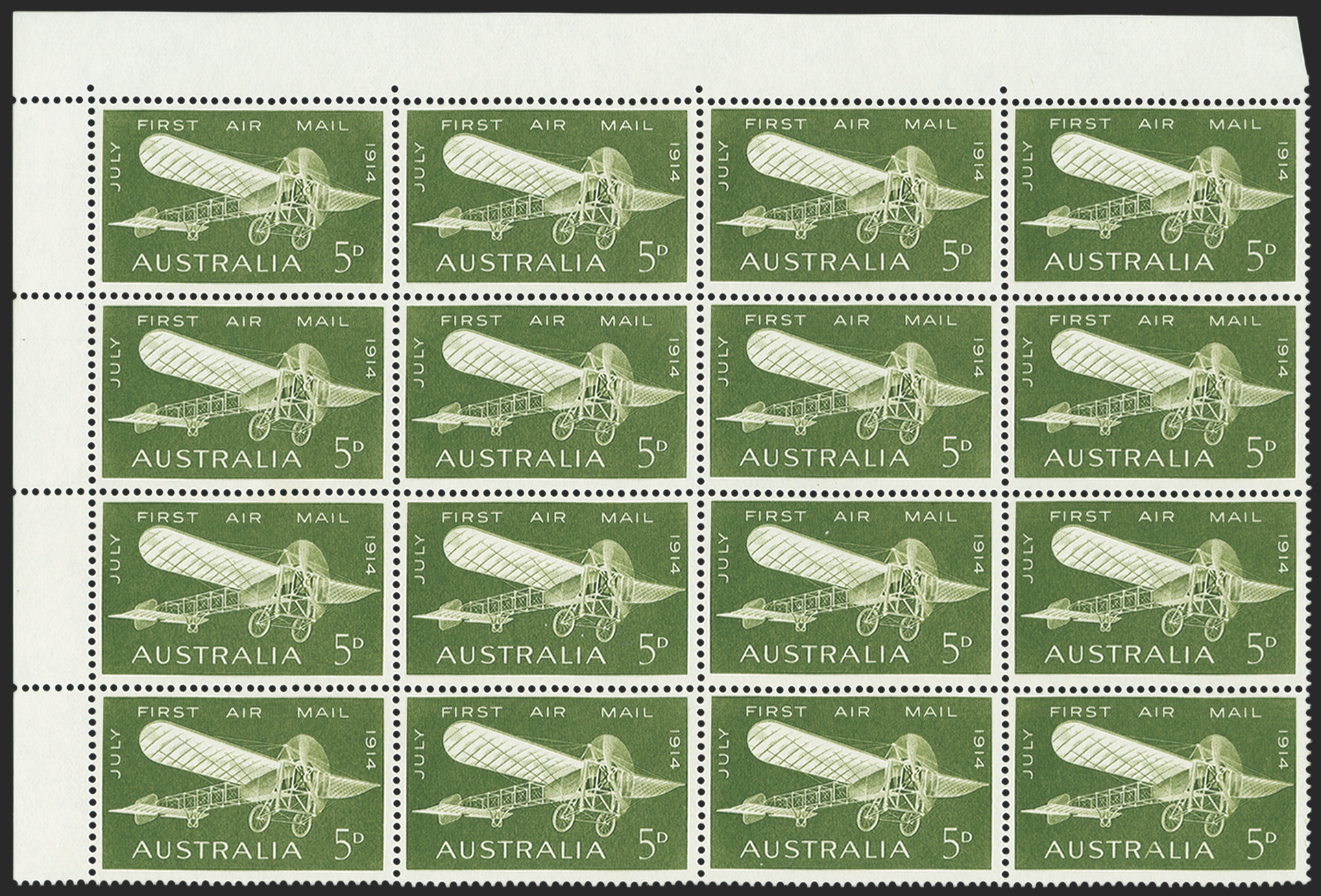 Australia 1964, 50th Anniversary of the first Australian Airmail Flight, 5d olive-green, SG370a, upper left corner block of 16 (4x4) lower right stamp (R4/4, upper right plate) showing 'Re-entry' to second 'A' of 'AUSTRALIA'.
