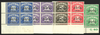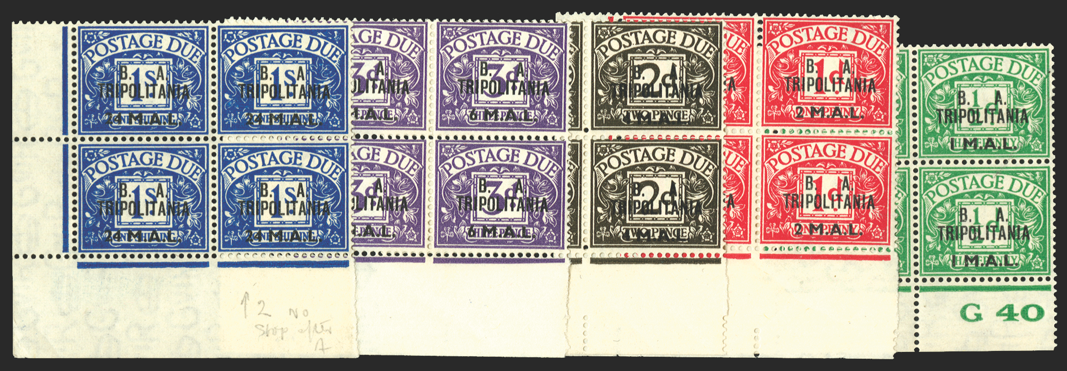British Occupation of Italian Colonies Tripolitania 1950 'B.A.TRIPOLITANIA' set of 5 to 24l on 1s POSTAGE DUES, watermark sideways except 6l on 3d sideways inverted, matching lower left corner marginal blocks of 4. The 24l on 1s shows the R11/2 variety 'No stop after A', the 1l on ½d with 'G40' control number, SGTD6/10a.
