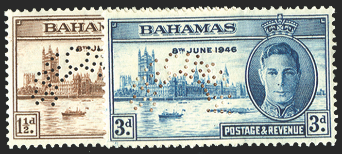 Bahamas 1946 Victory 1½d brown and 3d blue, perforated 'SPECIMEN' (type D21), SG176s/7s.
