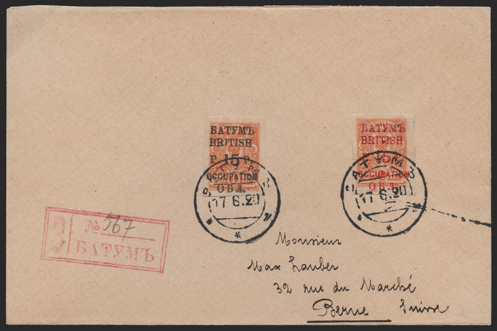 Batum British Occupation 1920 (17 June) registered "Lauber" cover to Switzerland, franked by 1919 (27 Nov) 15r on 1k orange x 2 with type 5 surcharges respectively in black, SG20, 20a.