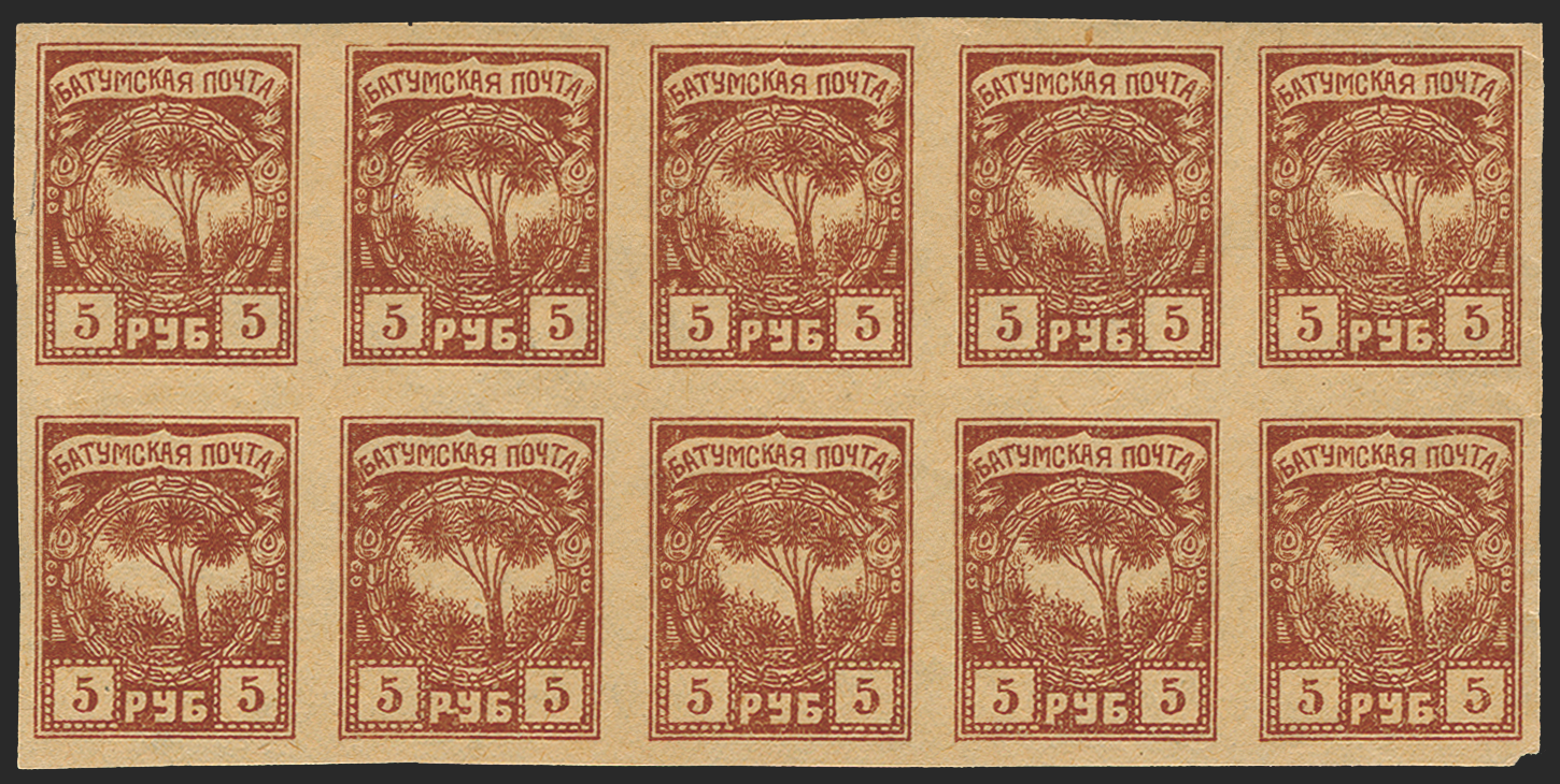 Batum British Occupation 1919 (4 Apr) 5r brown, block of 10 (5x2) showing transfers ABABA/CDCDC, SG6.