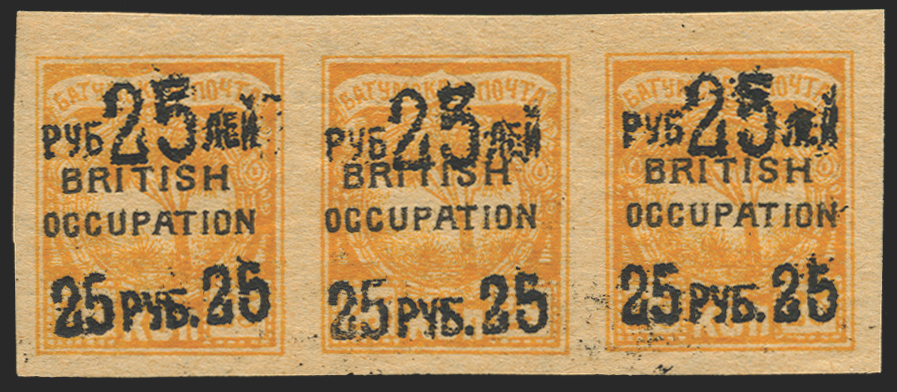 Batum British Occupation 1920 (1 Apr) 25r on 25k orange-yellow, type 7 surcharge in black, horizontal strip of three, SG43.