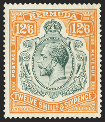 Bermuda 1924-32 12s6d grey and orange, April 1935 (fourth) printing, variety 'Broken crown and scroll' (R2/12), SG93b.