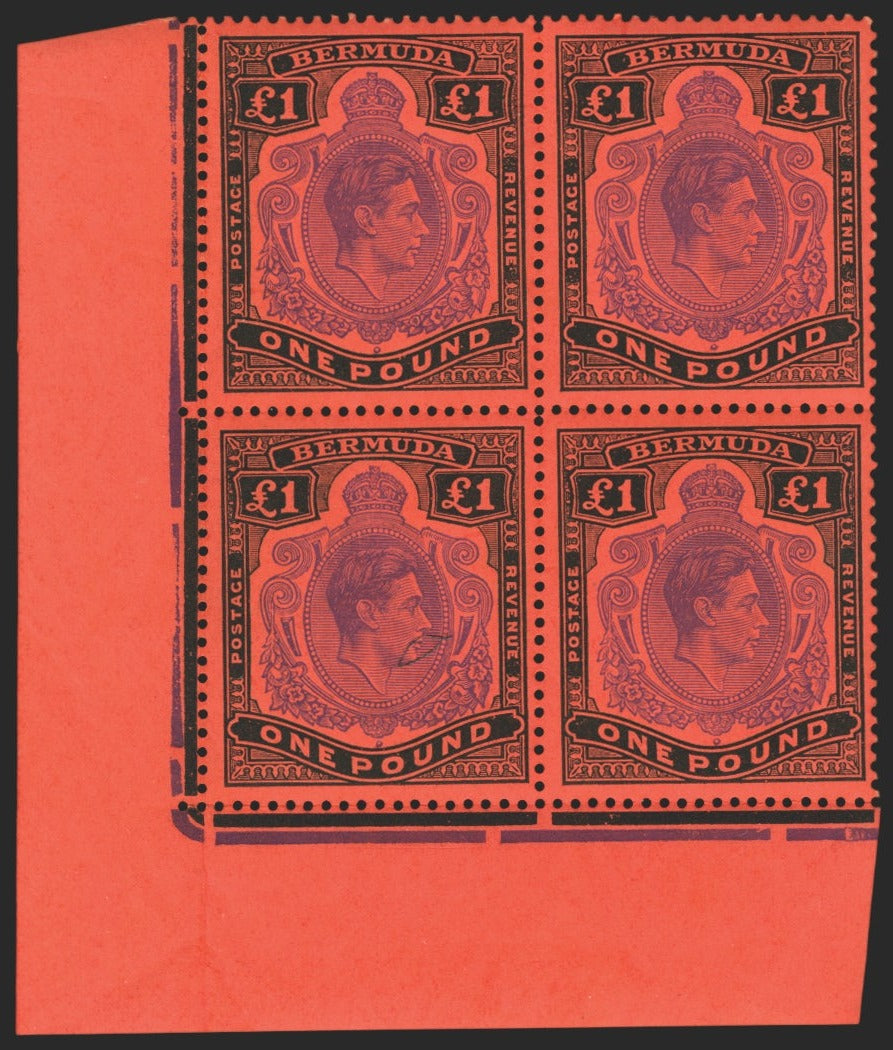 Bermuda 1938-53 £1 violet and black/scarlet, perforations 13, lower left corner block of four, SG121d.