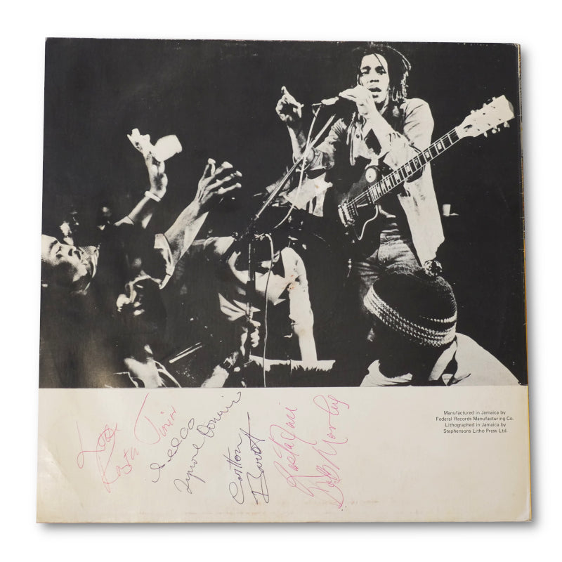 This 1977 12" single was only released in Jamaica on Marley's own Tuff Gong record label, and bears the signatures of Marley along with members of his band Junior Marvin, Tyrone Downie and Carlton Barrett.
