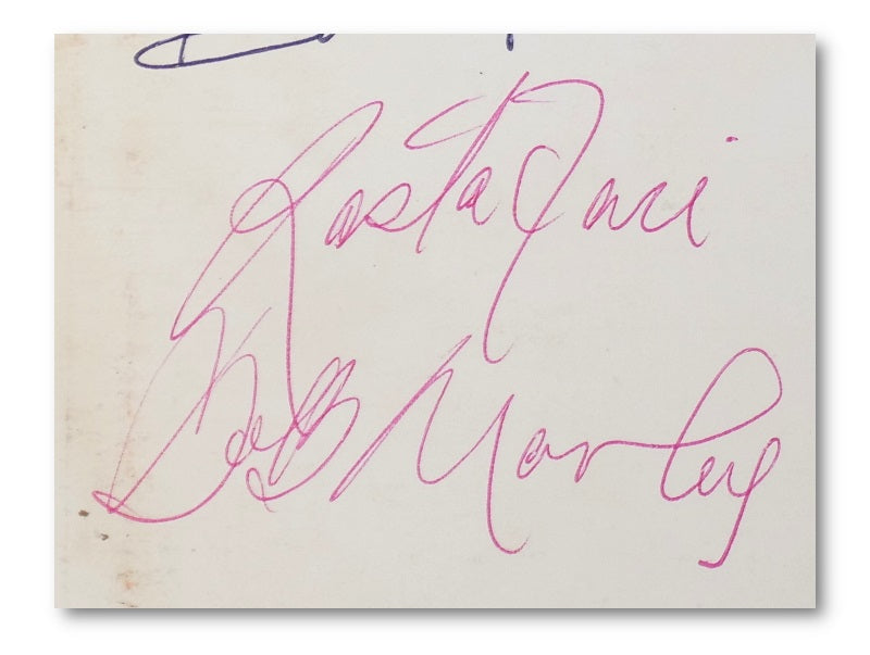 A remarkably rare and sought-after item, with a superb example of Marley's signature signed "Rastafari Bob Marley".