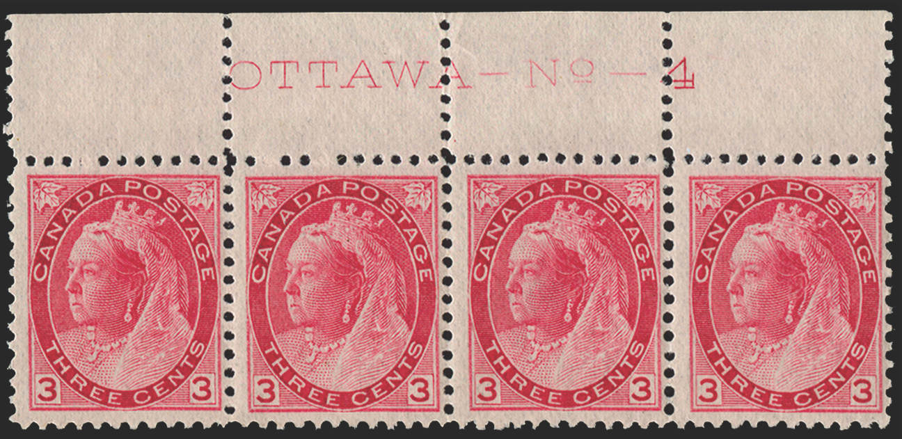 Canada 1898-1902 'Numerals' 3c rose-carmine upper marginal horizontal strip of four with complete 'OTTAWA-No-4' imprint and plate number, SG156.
