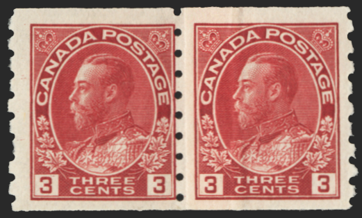 Canada King George V 1922-31 3c carmine, die I, imperforated x perforated 8, horizontal pair showing coil join, SG258.