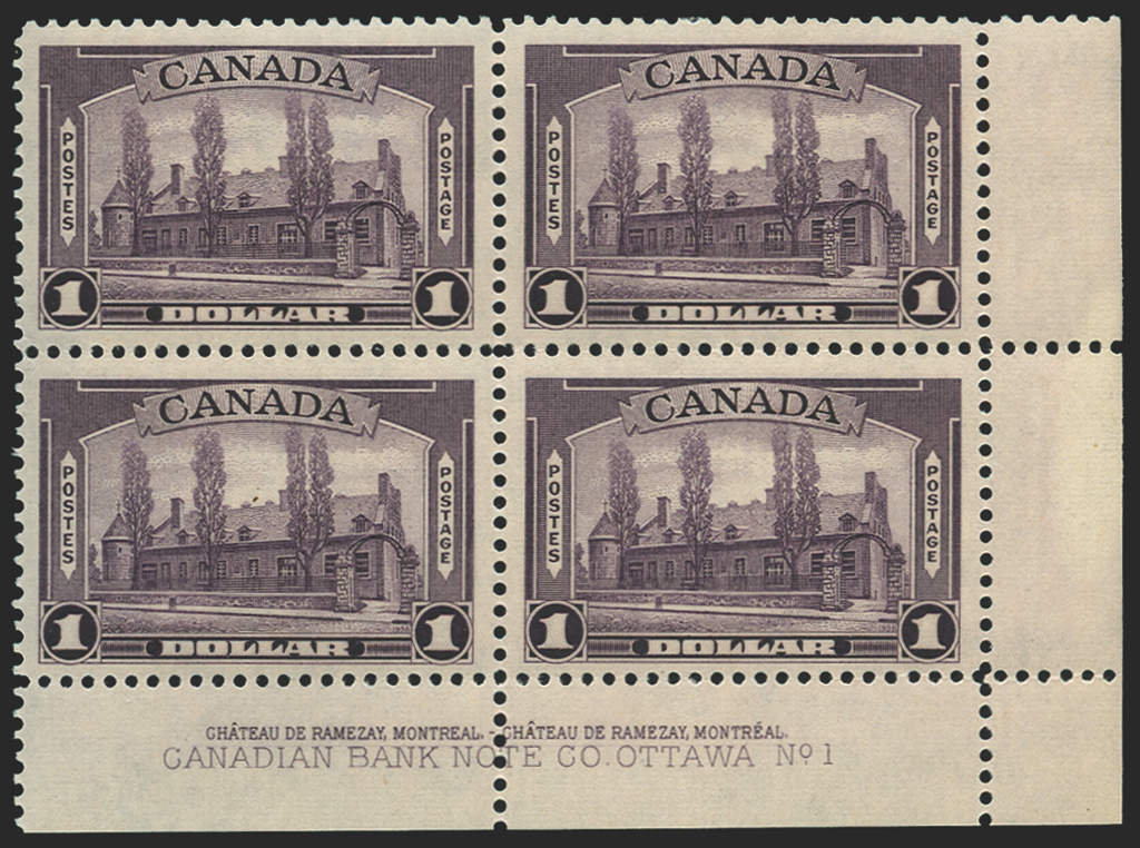 Canada 1937-38 $1 violet 'Chateau de Ramezay', lower right corner plate and imprint block of 4, SG367.