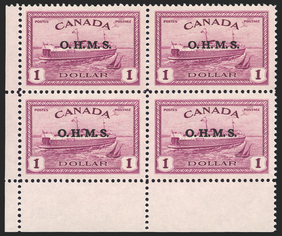 Canada Official Stamps 1949 $1 purple 'Ferry', type O3 'O.H.M.S.' overprint, lower left corner block of 4, SGO170.
