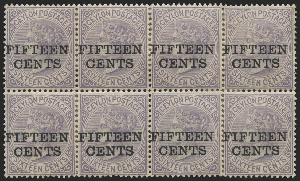 Ceylon 1885 15c on 16c pale violet, local surcharge as type 22, block of 8 (4x2) from position 8-11 of the setting, SG186.