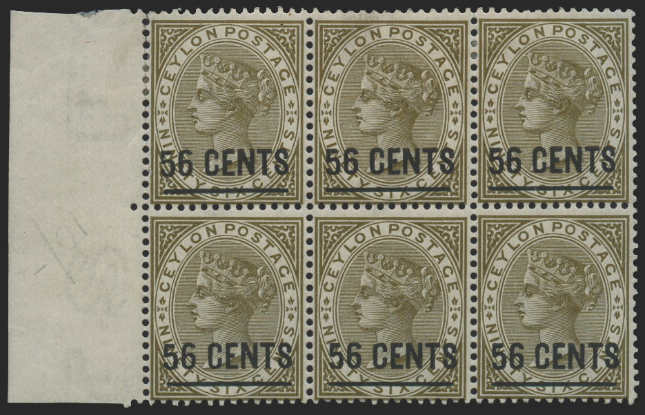 Ceylon 1885 56c on 96c drab, De La Rue type 26 surcharge, block of 6 (3x2) from left of sheet, SG192.