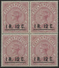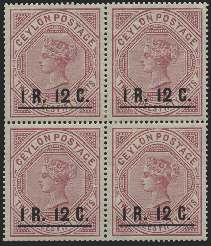 Ceylon 1885 1r 12 on 2r 50 dull rose, type 27 De La Rue surcharge, perforations 14, block of 4, SG193.