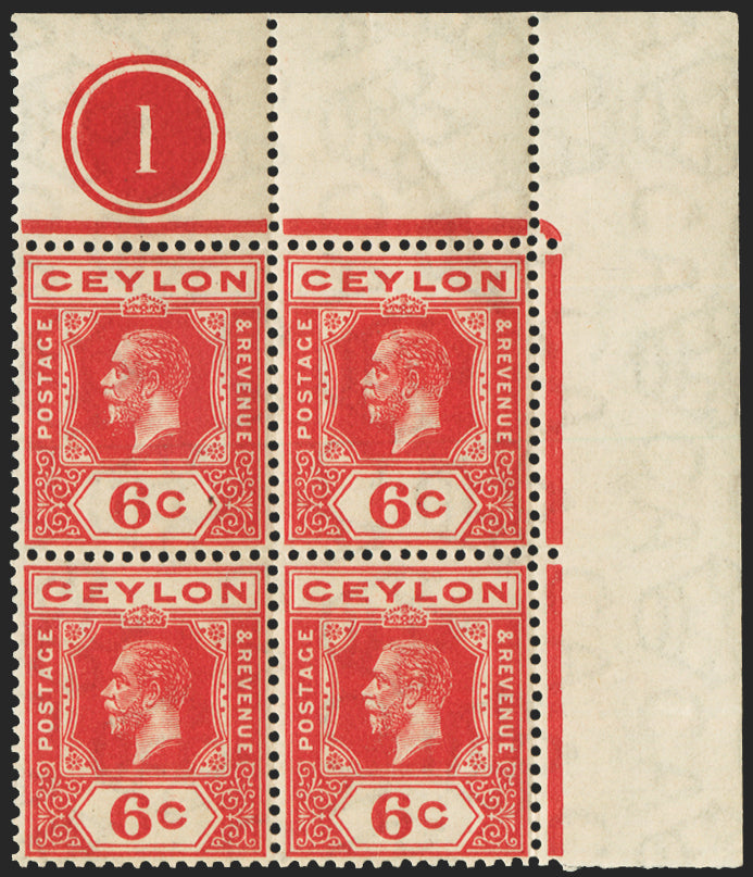 Ceylon 1912-25 6c pale scarlet (single plate), Watermark MCA, variety watermark sideways (to left from back), upper right corner block of 4 with plate number '1', SG305a.