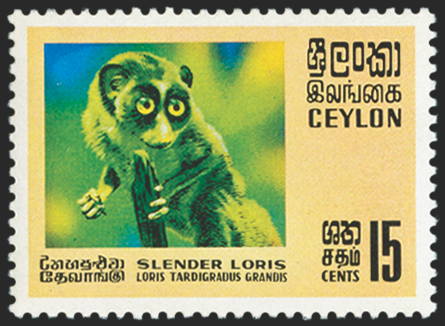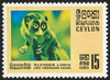 Ceylon 1970 Wildlife 15c 'Slender Loris', error magenta omitted (leaving the sky blue instead of violet, and the animal green and yellow instead of brown), SG562a.