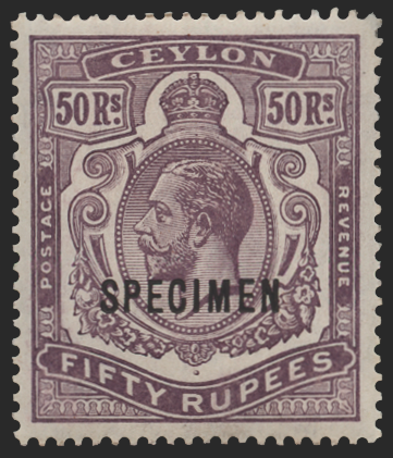 Ceylon 1912-25 50r dull purple, watermark MCA, overprint "SPECIMEN", SG320s.