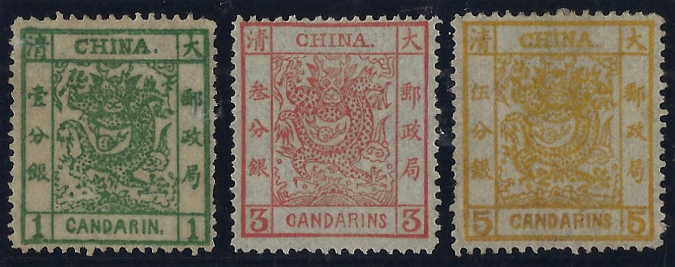 A fine quality mint set of the first stamp issues of the Chinese Empire. The first two are unused without gum, the 5ca with part original gum.