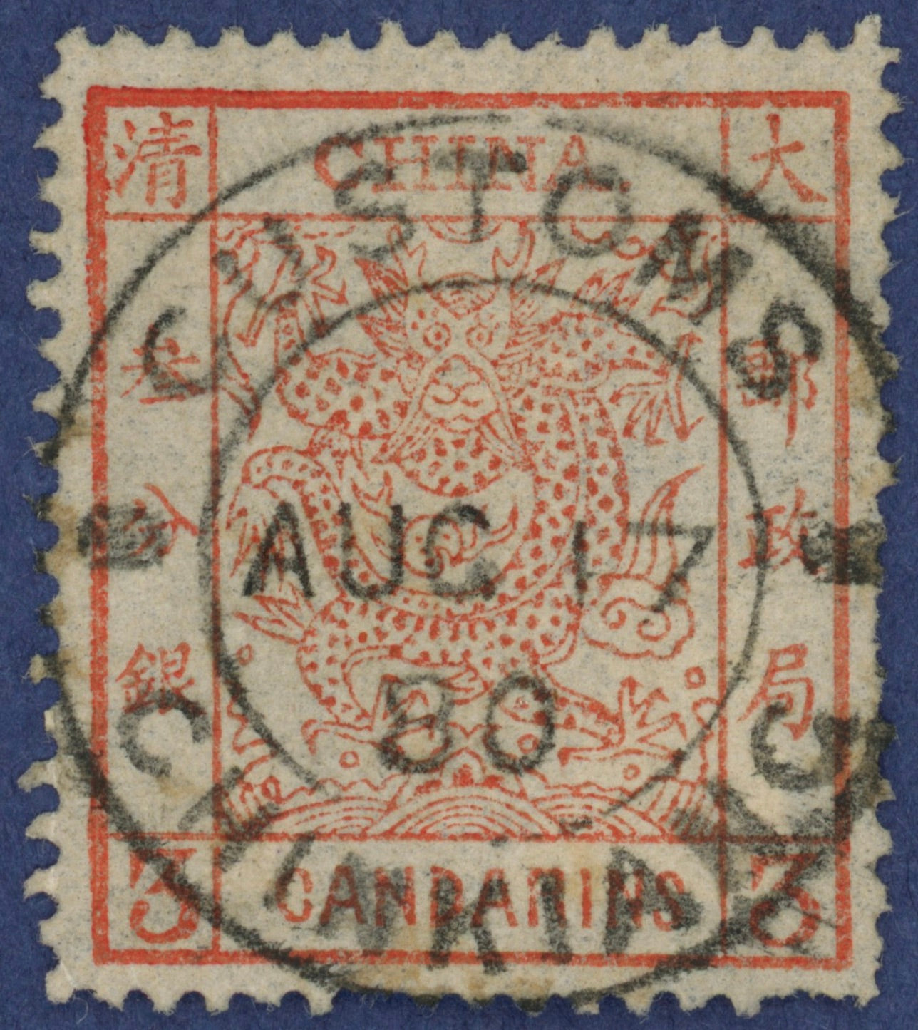 A stunning used example cancelled by a superb "Customs/Chinkiang" circular date stamp for 'Aug 17 80'. A couple of short perforations, but an exceptionally fine strike.