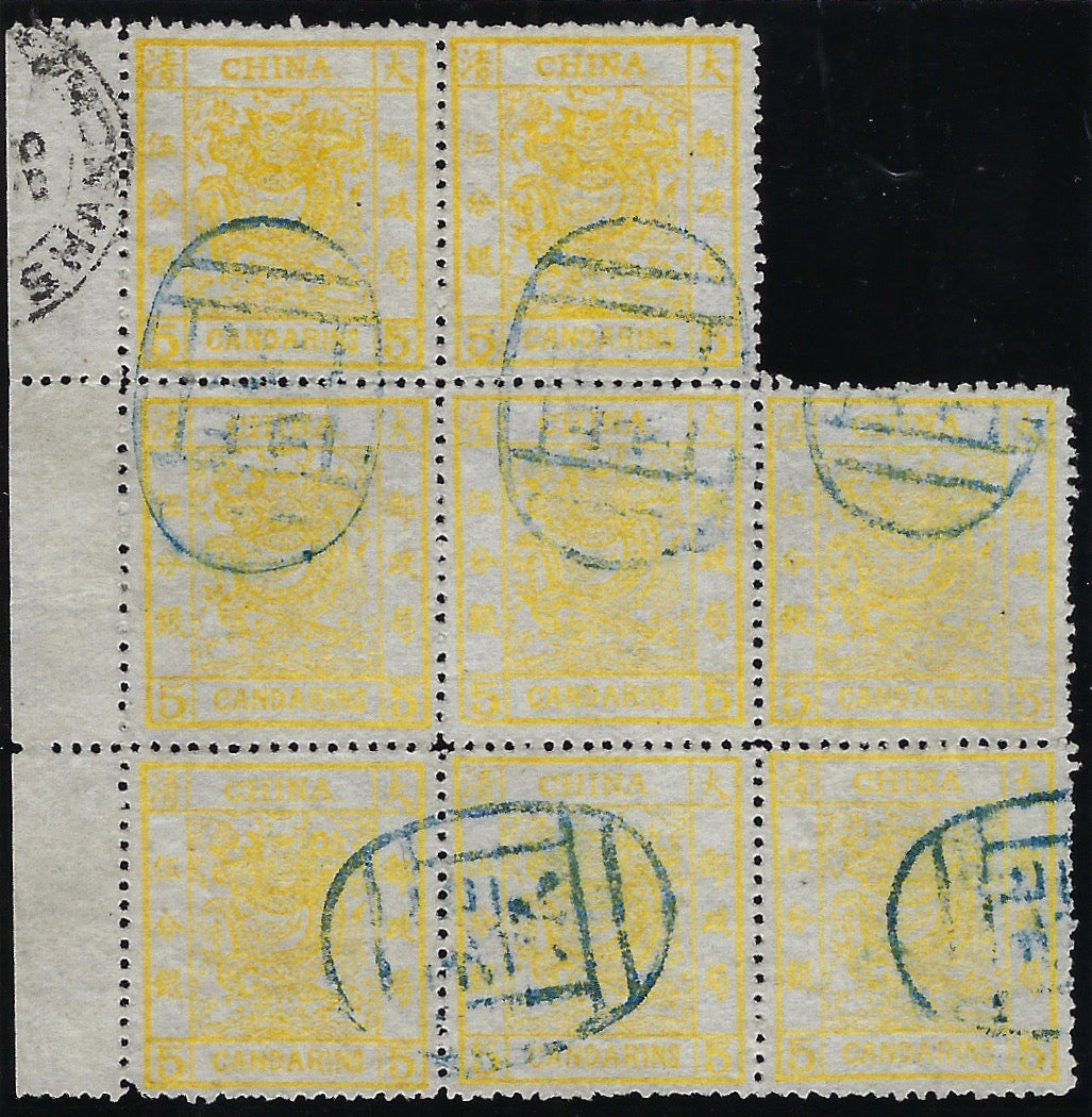 China 1883 5ca chrome-yellow 'Candarins', thicker paper, 2½mm spacing, clean-cut perforations, irregular 'L' shaped block of eight from setting VI (cliches 7, 24/15, 1, 9/21, 19, 14) with sheet margin at left, SG9.