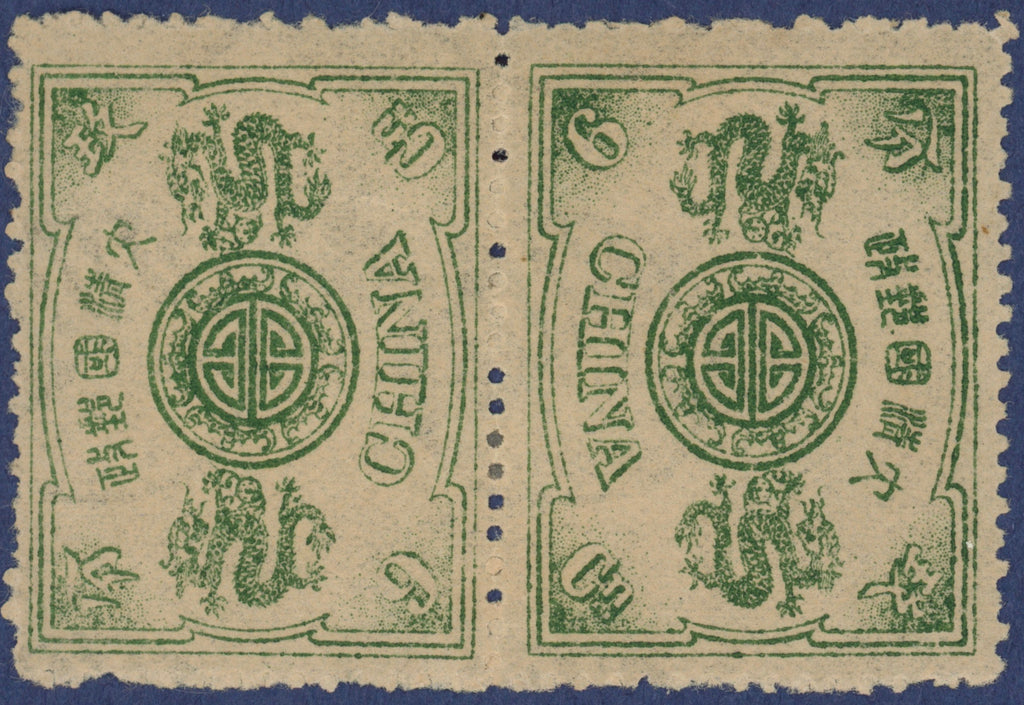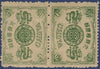 China 1894 60th Birthday of Dowager Empress 9ca dull green, vertical tete-beche pair, SG22d.