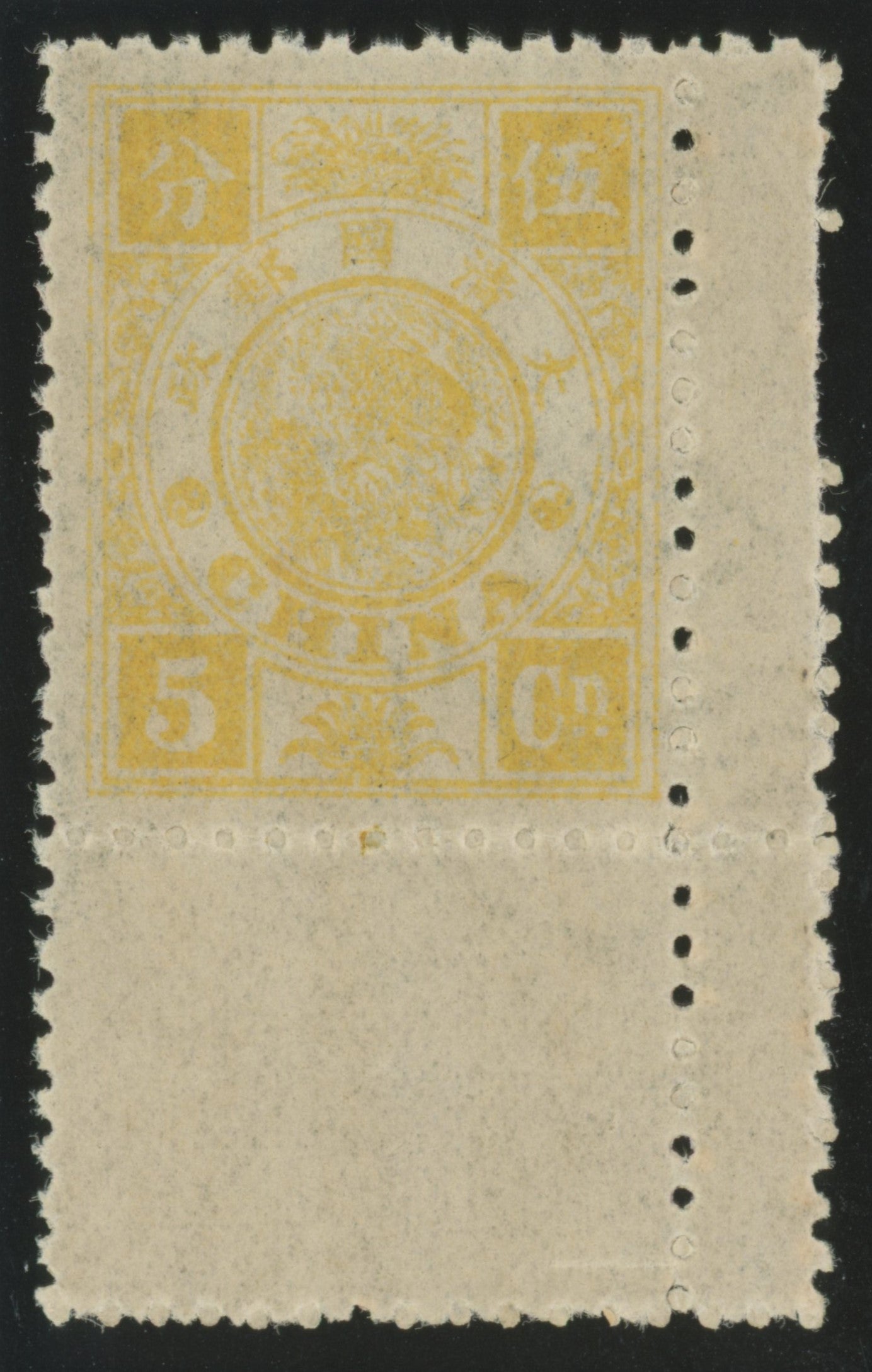 China 1897 5ca yellow "60th Birthday of the Dowager Empress" from the unissued second printing, SG29.