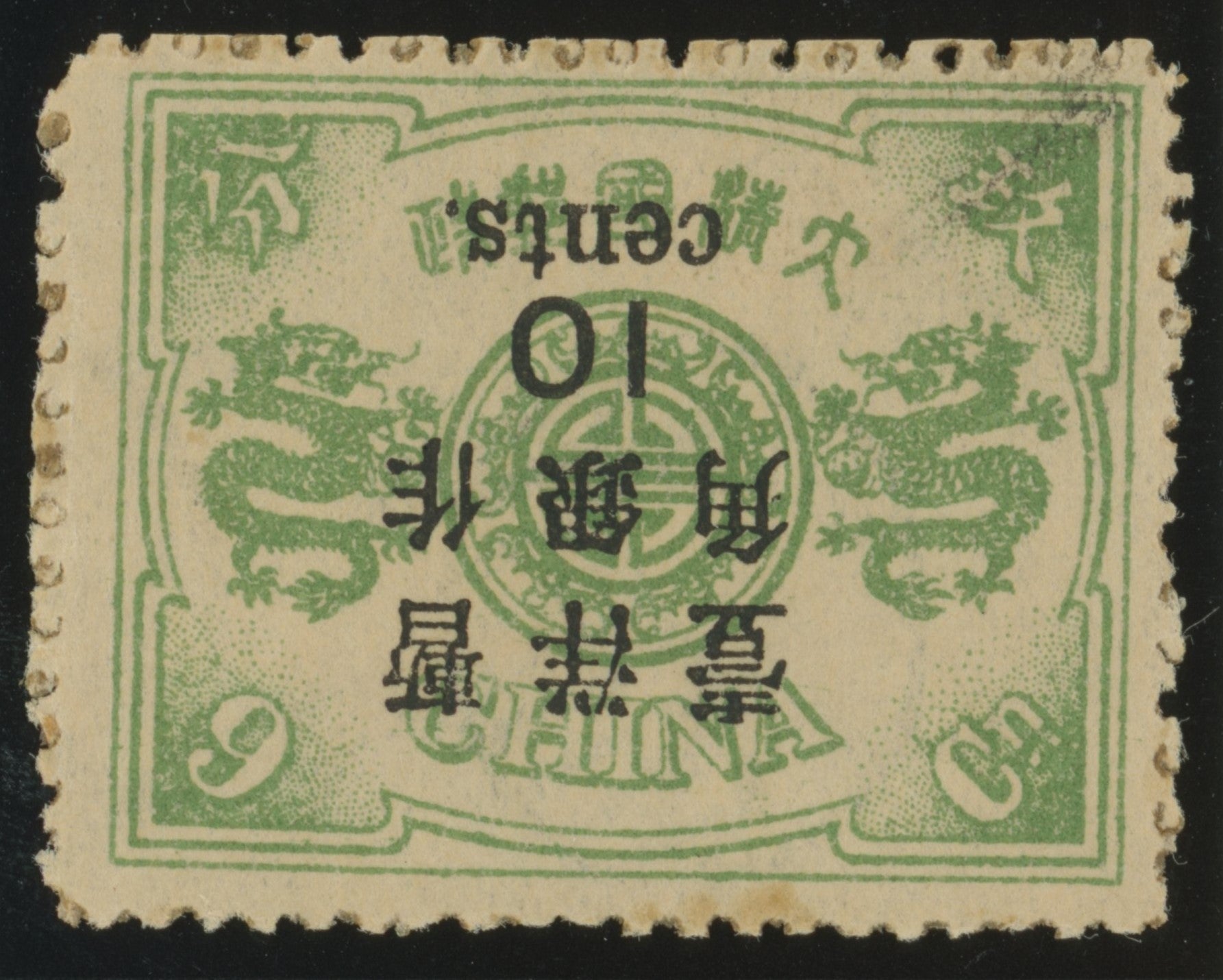China 1897 (May) 10c on 9ca grey-green 60th Birthday of the Dowager Empress (3rd printing) large figure surcharge INVERTED, 1½mm spacing, SG83a.