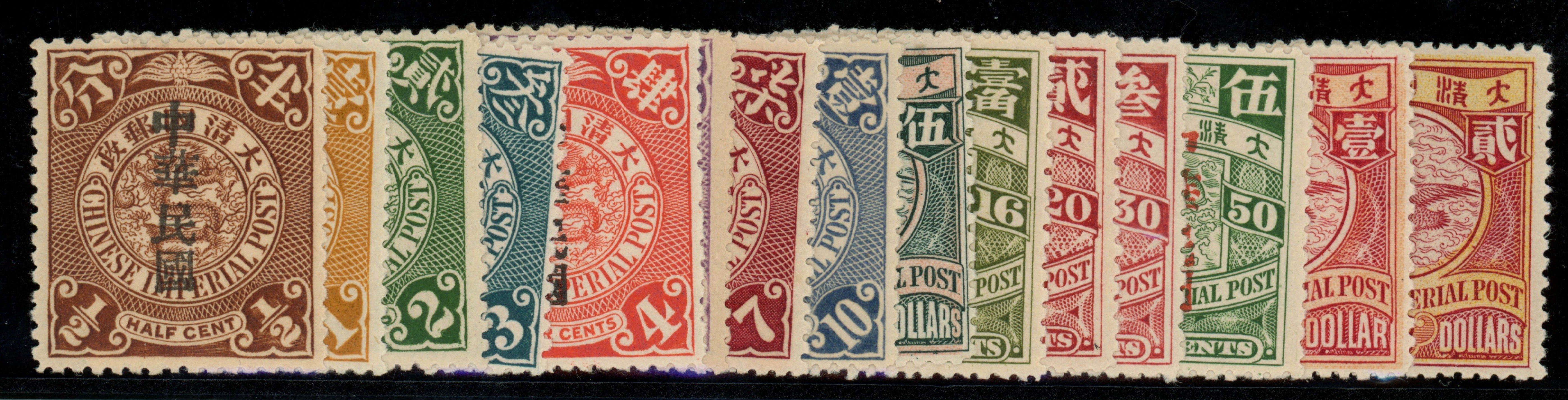 China 1912 Shanghai Republican overprint set of 15 to $5 myrtle and salmon, SG192/206