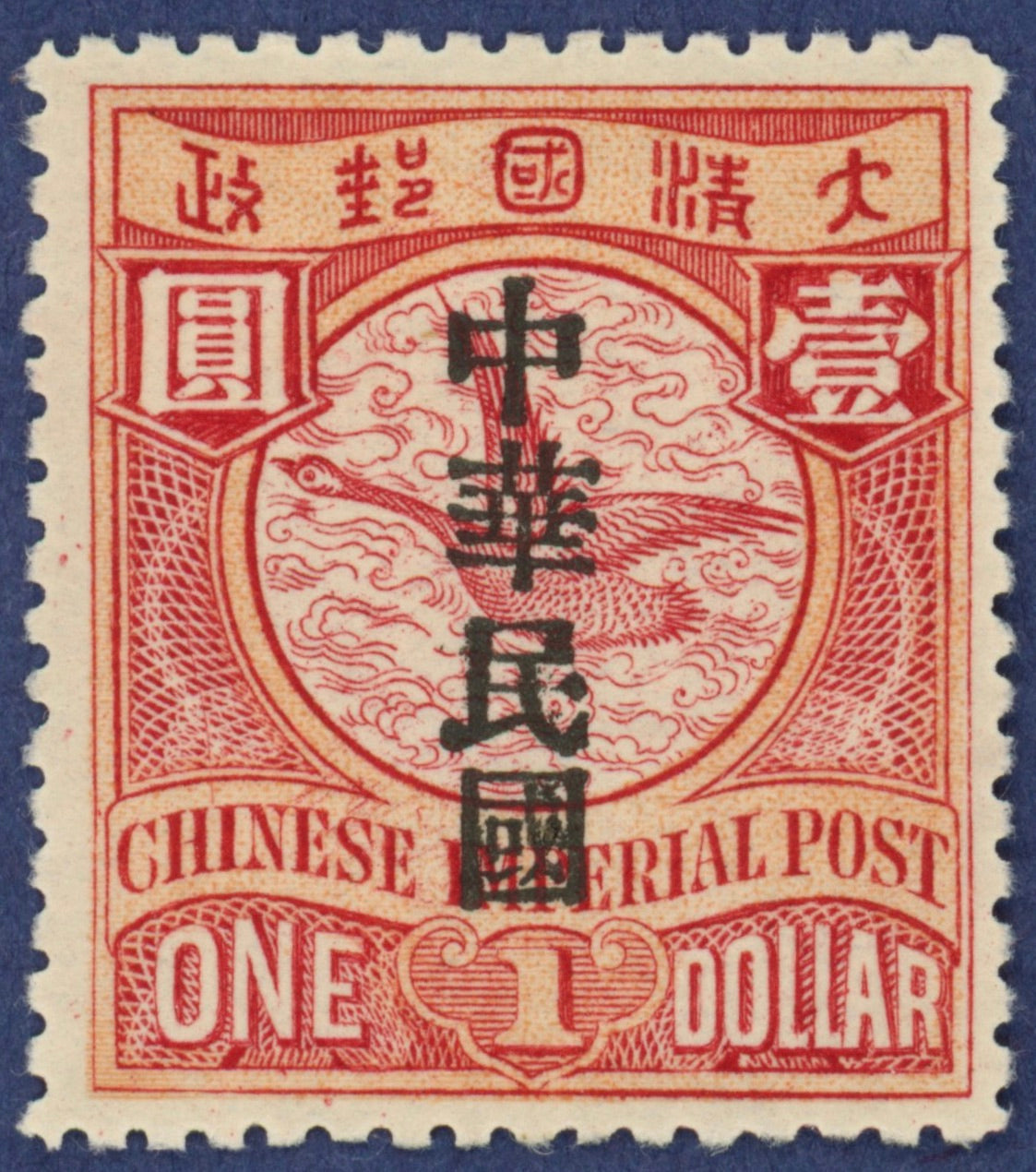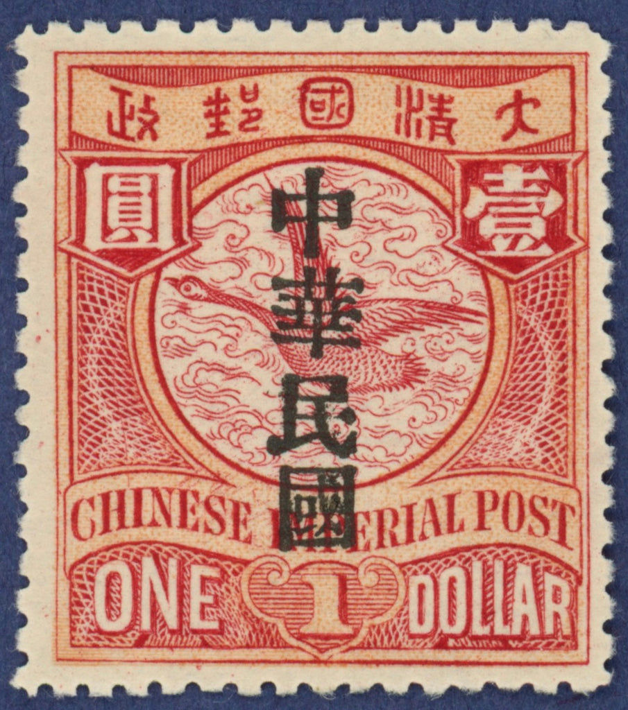 China 1912 $1 red and flesh 'Bean Goose', overprinted at the Shanghai Statistical Dept of Customs with 'Republic of China', SG204.