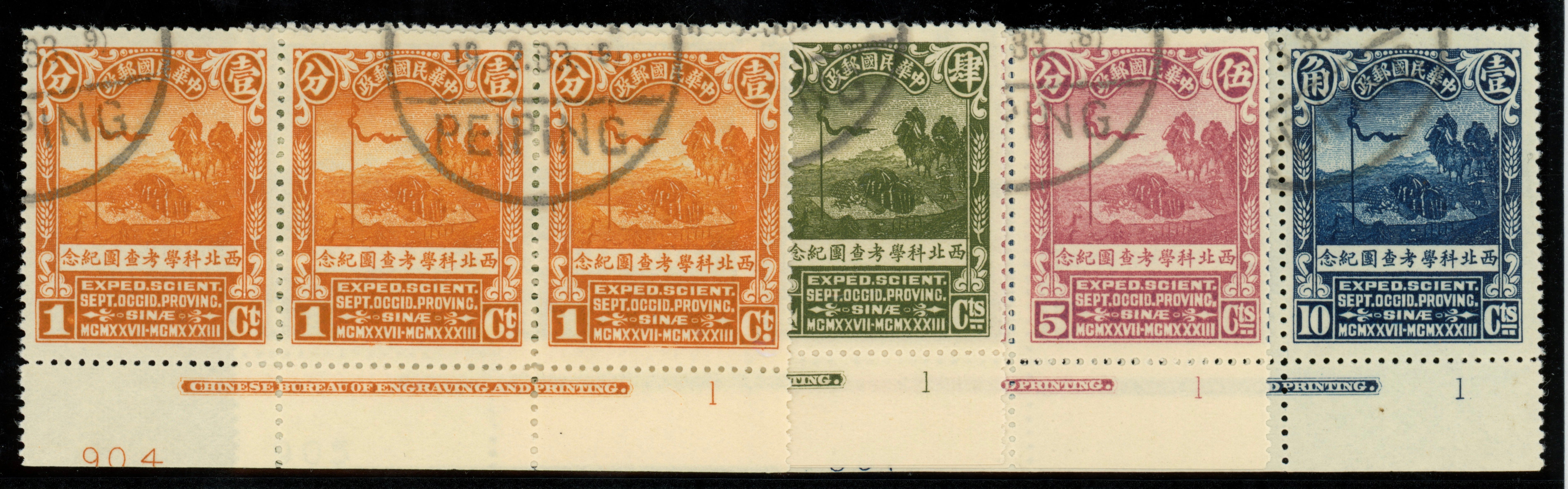 China 1932 North West Scientific Expedition set of 4 to 10c deep blue in lower marginal horizontal strips of 3 with imprint and plate number, SG406/09.