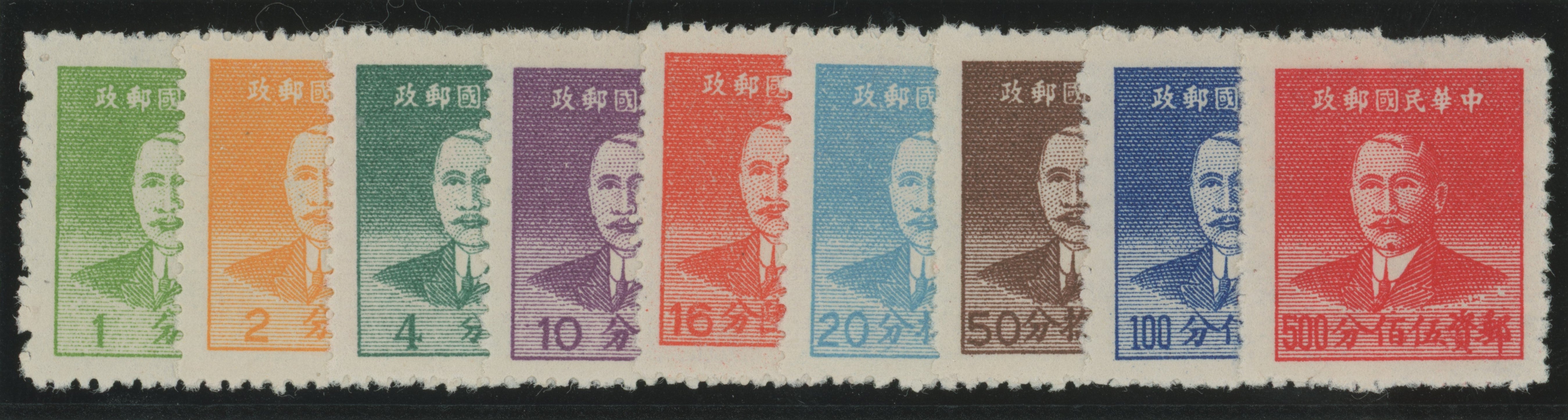 China 1949 (8 June) Sun Yat-sen silver yuan set of 9 to 500c scarlet Hwa Nam printing, SG 1348/56.