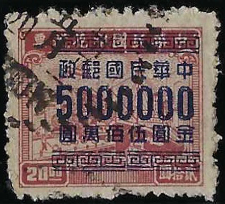 China 1949 Hankow gold yuan surcharges $5,000,000 on $20 red-brown, SG1193
